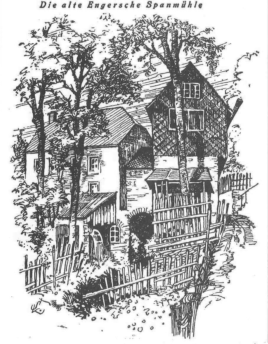 Mit Fischers Tochter gelangte die Mühle 1789 an Karl Gottlob Enger, dessen Familie sie über Generationen prägte. 1857 ließ Karl Friedrich Wilhelm Enger die Mühle so umbauen, wie sie Zeichnung der Engerschen Spanmühle von Kurt Franz Schneider ca. 1970 heute noch weitgehend erhalten ist. Das dort gezogene Buchenspan-Halbzeug war Grundlage für Trommelreifen, Siebränder, Schuhsohlen und vor allem für Spanschachteln, in denen die berühmten Grünhainichener Spielwaren verpackt wurden – begehrte Produkte auf der Leipziger Messe. Nach 1945 wurde das Sortiment durch Wilhelm Enger deutlich erweitert, da er als Drechslermeister auch verschiedenste gedrehte Weihnachtsartikel und Spielsachen fertigen konnte. Sporadisch wurde bis 1976 noch gearbeitet, doch mit dem Tod Wilhelm Engers 1988 endete das Handwerk. Die Mühle verfiel zusehends.